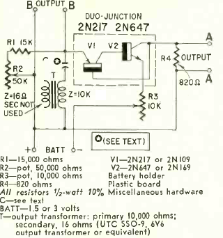 Na figura temos um circuito que simula um transistor unijunção num oscilador obtido numa Radio Electronics de outubro de 1960. O circuito é alimentado por bateria de 1,5 ou 3 V.
