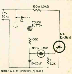 Encontramos este circuito numa Radio Electronics de janeiro de 1967. O SCR já é o C106 que foi um dos primeiros da família a ser lançando. O circuito não tem isolamento da rede de energia.