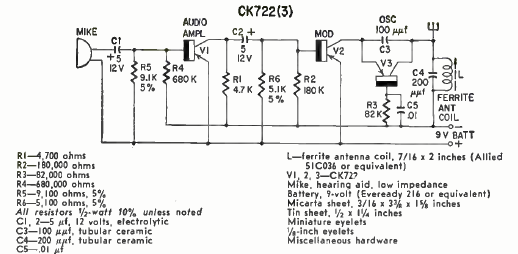 Este pequeno transmissor experimental com os transistores CK722 foi encontrado na revista Radio Electronics de novembro de 1959. O alcance é de alguns metros e a faixa de ondas médias.