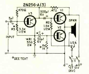 Publicado na Radio Electronics de outubro de 1963 este circuito aumenta a saída de áudio de um pequeno rádio transistorizado da época. O circuito não usa transformadores e os transistores são da época. A alimentação é feita por bateria.