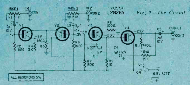 Publicado na revista Radio Electronics de março de 1963, este circuito usa 4 transistores da época. A resposta é plana até 20 kHz e a alimentação feita por bateria de 6,5 V.