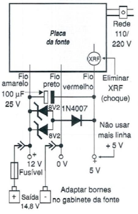 • Elimine o XRF (choque) da linha de +5 V. Com essa eliminação, a tensão de 12 V da salda vai subir para um valor em torno de 25 V.