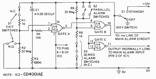 Encontrado na revista Radio Electronics de maio de 1975 este circuito liga depois de um certo tempo. Com isso o proprietário do local tem tempo de sair antes do alarme ser ativado.