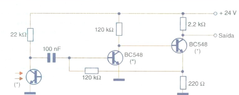 Um recurso para se evitar a influência da luz ambiente, ou ainda a ação de fontes de luz externas no circuito detector, é o uso de luz modulada. O sinal resultante de um circuito sensor como o mostrado na figura seguinte é um tom de frequência igual à usada na modulação, e pode ser aplicado a um PLL para detecção ou ainda a um circuito reconhecedor de outro tipo, incluindo os que fazem uso de DSPs. No circuito indicado, o resistor de 22 k Ω em série com o sensor pode ser alterado em função da sensibilidade desejada. O fototransistor usado deve ser de tipo escolhido de acordo com a aplicação, mas em geral os tipos comuns como o TIL78 admitem operação com sinais modulados em até algumas centenas de quilohertz. O circuito completo para esta aplicação está na figura.