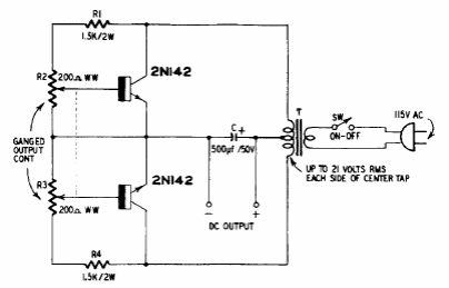 Esta interessante fonte ajustável usa os próprios transistores como controladores e como retificadores. O circuito é dos anos 60, e os transistores são da época.