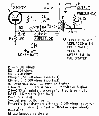 Este oscilador de um transistor foi encontrado na revista Radio Electronics de fevereiro de 1962. O circuito usa um transformador miniatura da época e a alimentação vem de pilhas ou bateria.