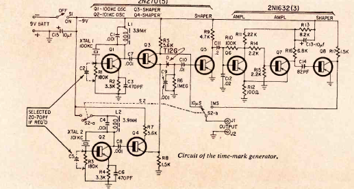 Este é um circuito antigo com um recurso que a maioria dos osciloscópios modernos possuem. Encontramos numa Radio Electronics de abril de 1965. O circuito gera sinais de frequências conhecidas para servir de referência num osciloscópio.