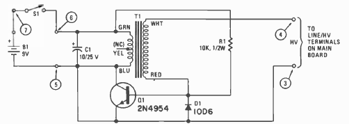 Este circuito se destina a obtenção de alta tensão para circuitos que tenham lâmpada neon e sejam alimentados por baterias. O circuito é de uma Radio Electronics de março de 1977.