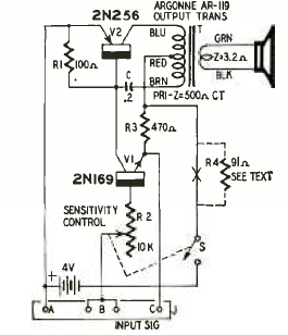Este circuito foi encontrado na revista Radio Electronics de setembro de 1959. O circuito emite um som forte quando disparado. A alimentação vem de uma bateria de 4 V.