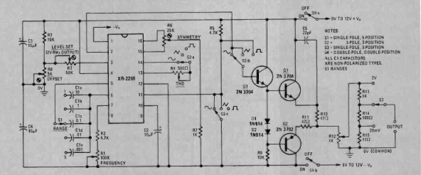 Este bom circuito de gerador de funções com o XR2206 foi encontrado na revista Radio Electronics de maio de 1977. O circuito tem uma etapa de saída com transistores.