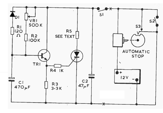Este intervalador para limpador de para-brisas foi encontrado numa antiga documentação. O SCR pode ser o C106 e o transistor um BC548.