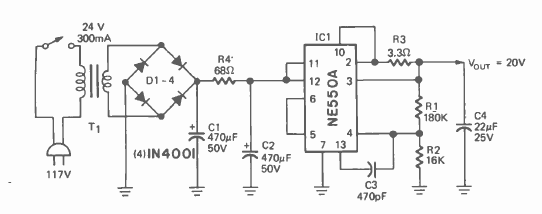 Indicada para alimentar um circuito de um sistema decodificador, esta fonte usava um circuito regulador da época. Encontramos na revista Radio Electronics de outubro de 1975. A corrente é da ordem de 200 mA.