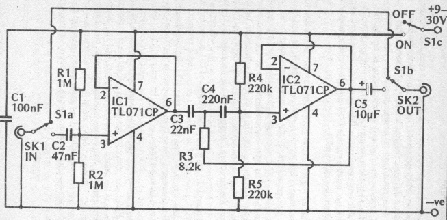 Este circuito filtro o ruído de baixa frequência do motor de toca-discos. Encontramos numa documentação de 1989. A fonte não precisa ser simétrica, mas deve ter excelente filtragem.