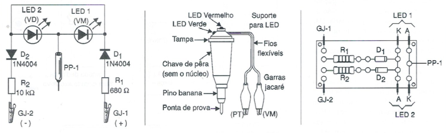 O circuito foi projetado para operar em instalações de 12 V, mas os valores dos resistores podem ser alterados para operar com outras tensões, e com isso ele poderá ser empregado no teste de fontes, como indicador de níveis lógicos em circuitos digitais. Os LEDs são comuns (verde e vermelho) e os diodos podem ser substituídos por tipos equivalentes. Os cabos de conexão devem ter comprimentos apropriados para face tilar o trabalho numa instalação de fonte ou carro, conforme o caso.