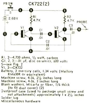 Este simples injetor de sinais foi encontrado numa Radio Electronics de julho de 1959. Os transistores são os CK722 e a frequência gerada depende dos capacitores. O sinal é rico em harmônicas.