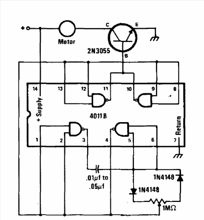 Este circuito PWM foi encontrado numa publicação americana de 1978. Ele consiste num simples controle que, na realidade pode controlar motores de 3 a 12 V com correntes até uns 3 A. O transistor deve ser dotado de um radiador de calor, se a corrente do motor for maior do que 1 A. O circuito pode ser adaptado para operar como um shield de controle. Podem ser usados transistores de menor corrente, de acordo com o motor, como os BD135, TIP31, etc.