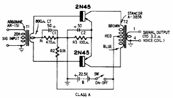 Este circuito de baixa potência, classe A usa dois transistores de germânio antigos. O circuito foi encontrado numa publicação americana dos anos 50. A impedância de entrada é de 20k.