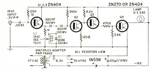 Este circuito foi encontrado numa revista Radio Electronics de agosto de 1963. Os transistores são tipos da época e o indicador é uma lâmpada incandescente comum. O circuito é excitado pelo sinal das etapas de amplificação de FI do receptor.