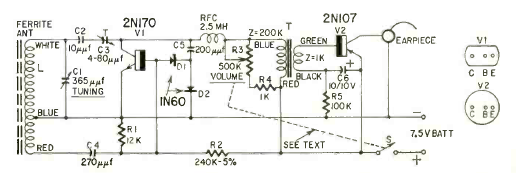 Este simples receptor de dois transistores foi encontrado na revista Radio Electronics de setembro de 1960. Os transistores são da época e a escuta é feita em fone de ouvido.
