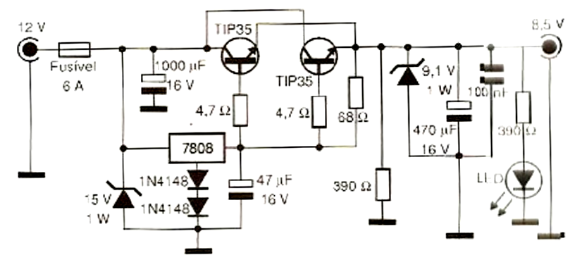 O simples circuito apresentado oferece então a solução, pois fornece a tensão e corrente necessárias para o perfeito funcionamento do game nesta situação. O C17808 estabiliza a tensão e polariza os transistores do forma que eles supram o game com a corrente exigida ao seu funciona- mento. Os diodos zeners protegem a entrada e a saída do circuito contra sobretensões. A conexão no carro pode ser feita na saída do acendedor de cigarros. Lembramos que o fusível é um componente importante de proteção deste circuito e não deve ter seu valor alterado. Os transistores devem ser montados em um bom dissipador pois, devido ao consumo elevado, aquecem bastante. O CI 7808 não precisa de dissipador o os resistores são todos para 1/8 W. O LED pode ser de qualquer cor.