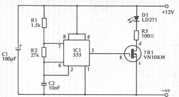 Este circuito dos anos 80 aciona um LED infravermelho, produzindo um sinal modulado. LEDs modernos de maior potência podem ser usados com a redução de R3.