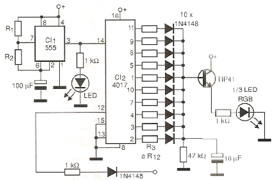 O circuito analisado aqui consiste em três osciladores independentes baseados no NE555, com frequências e ciclos ativos, diferentes, cada qual alimentando um CD4017. As saídas dos 4017 são ligadas a resistores de valores, diferentes, excitando então as bases de três transistores TIP41. Do mesmo modo que a corrente em cada transistor varia conforme a entrada excitada, os brilhos dos LEDs correspondentes também. Isso faz com que uma infinidade de cores sejam geradas de maneira aleatória.