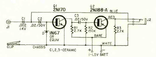 Este circuito de dois transistores é de uma Radio Electronics de dezembro de 1964. Podem ser testados transistores modernos. O fone de ouvido deve ser de alta impedância ou de cristal com um resistor de 2k2 em paralelo.