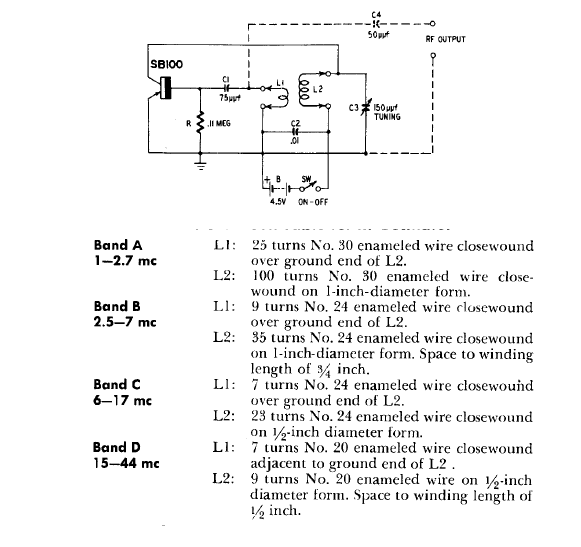 Este circuito admite diversos conjuntos de bobina podendo oscilar de 1 a 44 MHz. O transistor é de tipo especial antigo, pois o circuito foi encontrado em documentação dos anos 60.
