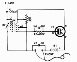Este simples receptor regenerativo para fone de alta impedância usa um transistor de germânio 2N107. O circuito é de uma documentação de 1966.