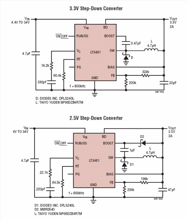 Um circuito integrado bastante interessante para projetos de conversores step-down (redutores de tensão) com uma capacidade de corrente de saída até 2 A é o LT3481 da Linear Technology (www.linear.com). Este componente tem uma faixa de tensões de entrada de 3,6 V a 34 V com um máximo de 36 V e uma frequência de comutação de 2,8 MHz. Na operação no modo burst o ripple com 50 uA Iq, 12 V de entrada e 3,3 V de saída. Este ripple nestas condições, é menor do que 15 mV. O diodo boost é integrado e a tensão de referência de feedback é de 1,265 V. O dispositivo pode fornecer tensões de saída de 1,265 V a 20 V e possui recursos para partida suave. A chave de potência incluída no chip tem uma resistência de apenas 0,18 ohms o que leva o dispositivo a alcançar elevadas eficiências, acima de 80% com a carga máxima. Na figura temos um circuito de aplicação para uma entrada de 6,3 V a 34 V e uma saída de 5 V. Para saídas de 3,3 V e 2,5 V com entradas na faixa de 4 a 34 V temos os dois circuitos mostrados na figura 5. Em todos os casos, temos recursos de shutdown que reduzem o consumo para menos de 1 uA. O dispositivo é fornecido em invólucro MSOP de 10 pinos e também DFN.