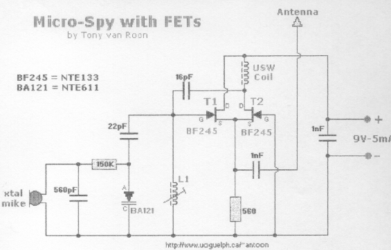 Este circuito é de uma documentação dos anos 90. O transistor pode ser qualquer FET de uso geral como o BF245, o indicado, e a bobina consiste em 4 espiras de fio 28 em forma de 0,5 cm sem núcleo para a faixa de FM.