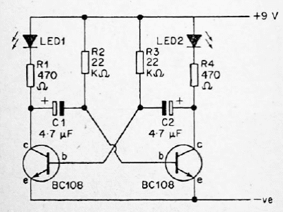 Os transistores deste circuito podem ser os BC548. Os capacitores determinam a frequência podendo ser alterados. A tensão de alimentação também pode ser alterada.