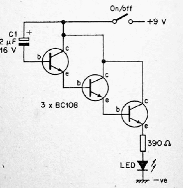 Uma vez ligado este circuito faz com que um LED permaneça aceso por aproximadamente 30 minutos. Capacitores maiores podem ser usados para mais tempo. Os transistores podem ser os BC548.