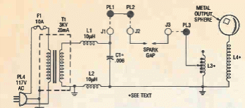 Esta é uma versão básica da bobina de Tesla que não usa dispositivos semicondutores, encontrada numa antiga Popular Electronics. O circuito usa um transformador do tipo usado em antigos anúncios neon de 3kV.