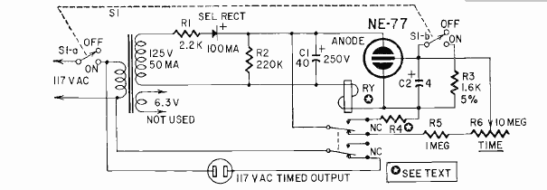 Este timer com uma lâpada neon com disparo externo foi encontrado na revista Radio Electronics de abril de 1960. O circuito é alimentado pela rede de energia.