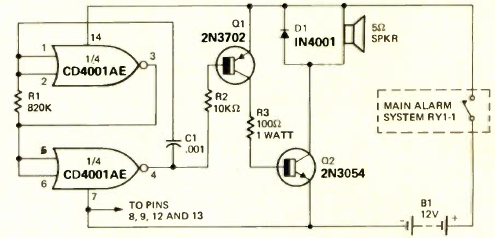 Este circuito de oscilador mono-tom para alarme foi encontrado na revista Radio Electronics de julho de 1975. A potência é dada pelo transistor de saída.