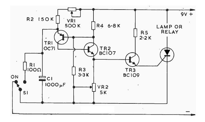 Este timer com SCRs foi encontrado numa documentação inglesa antiga. O SCR pode ser o TUIC106 e os transistores equivalentes modernos coo o BC557 para TR1 e BC547 para os demais.