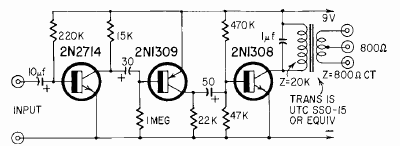 Este amplificador para “ondas cerebrais” foi publicado na revista Radio Electronics de agosto de 1964. Os transistores são da época e o circuito amplia os sinais de baixa frequência para um registrador. A alimentação é de 9 V.