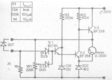 Encontramos este circuito provador de junções numa documentação inglesa antiga. O circuito serve para verificar a tensão de ruptura. Os transistores usados são tipos de alta tensão.