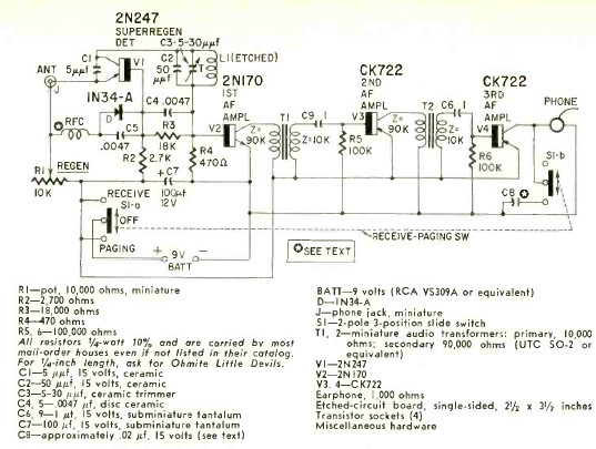 Este circuito foi encontrado na revista Radio Electronics de janeiro de 1961. Os transistores são os conhecidos CK722 e as frequências são dadas pelas bobinas.