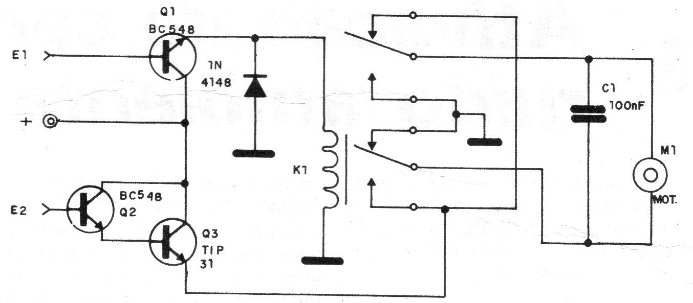Este circuito simples de uma documentação de 1987 pode ser usado em robótica e automação como, além de ser controlado por microcontroladores como Shield de potência. O relé é de 5 a 12 V conforme o tipo de controle e para melhor desempenho resistores de 1k devem ser ligados em série com as bases dos transistores. As funções de controle são: