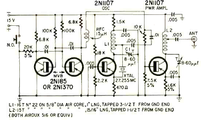 Este transmissor de controle remoto para a faixa dos 27 MHz foi encontrado na revista Radio Electronics de novembro de 1960. Informações sobre as bobinas são dadas junto ao diagrama.