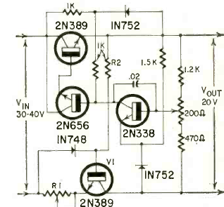 Na figura temos um circuito de regulador de tensão para fonte com proteção. Ele foi publicado na revista Radio Electronics de janeiro de 1961. Os componentes são da época.