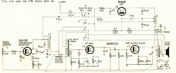 Este é o CW-30 da Heathkit, um receptor miniaturizado de 4 transistores para a faixa do cidadão ou 11 metros. O circuito saiu na revista Radio Electronics de junho de 1961. A alimentação era com bateria de 9V.
