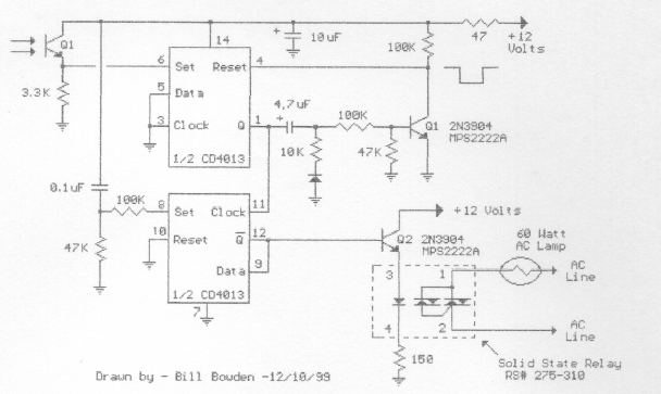 Recomendado para controle de um projetor, este circuito foi encontrado numa documentação dos anos 80. O circuito usa um acoplador óptico para controlar um triac. O sensor é um fototransistor comum.