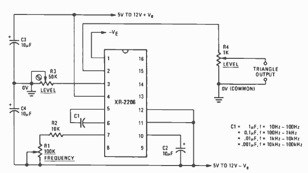 Encontrado numa Radio Electronics de abril de 1977, este circuito usa o conhecido XR2206. Os valores de C1 para as diversas faixas de frequência são dados junto ao diagrama.