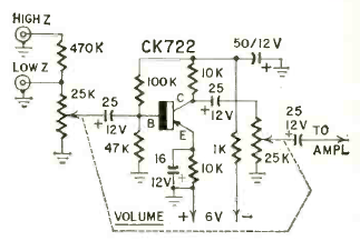 Este circuito preamplificador com um transistor CK722 saiu na revista Radio Electronics de setembro de 1959. A alimentação é feita com uma tensão de 6 V e são agregados dois controles de intensidade de sinal conjuntos.