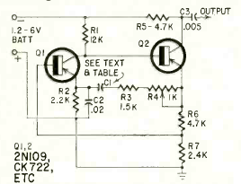 Este circuito bem conhecido de oscilador de dois transistores foi encontrado na revista Radio Electronics de abril de 1964. Os transistores são da época, coo o CK722 e 2N109, mas podem ser usados tipos modernos sem muitas alterações nos demais componentes.