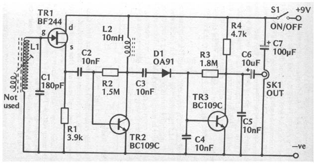 Este circuito sintoniza as rádios AM para aplicar o sinal a um bom amplificador de áudio. O circuito é de uma documentação antiga. Os transistores são tipos de uso geral.
