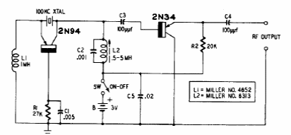 Este circuito para uma frequência de 100 kHz foi encontrado numa documentação dos anos 60. O circuito pode ser alterado para operar em outras frequências, com a troca do cristal.